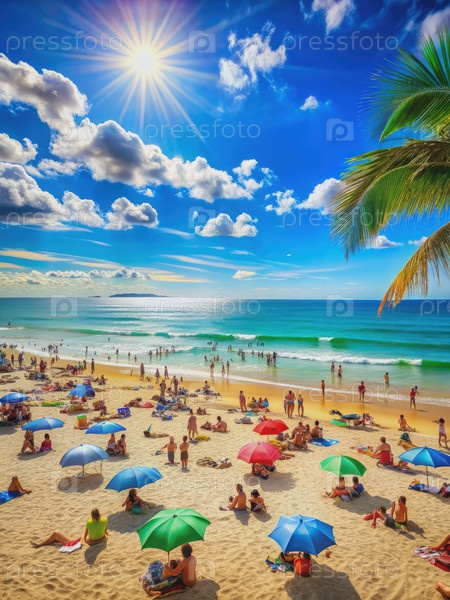 Солнечный день пляжный отдых с пальмами и зонтиками. генеративная ИИ