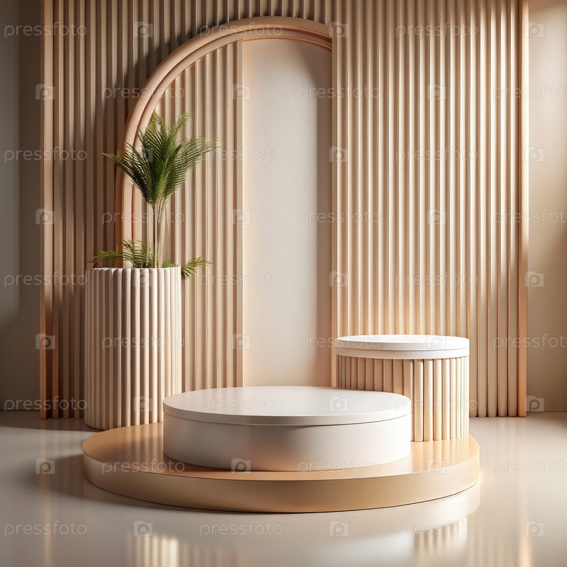 Минималистский продуктовый дисплей с деревянной аркой и подиумом
