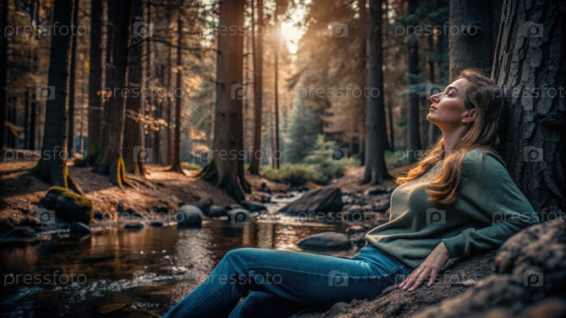 Расслабляющаяся женщина наслаждается спокойствием у тихого ручья в лесу во время Золотого часа