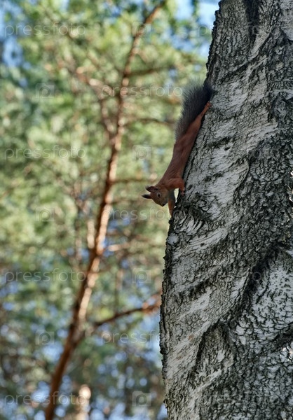 Россия, Кузбасс. Рыжая белка прогуливается по стволу березы в Зеньковском парке