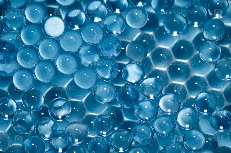 Синие гидрогелевые шарики в два слоя: хаотичный верхний в фокусе, нижний слой, лежащий упорядоченными шестиугольниками, размыт. Абстрактный фон, текстура, похожая на инопланетный материал, клетки
