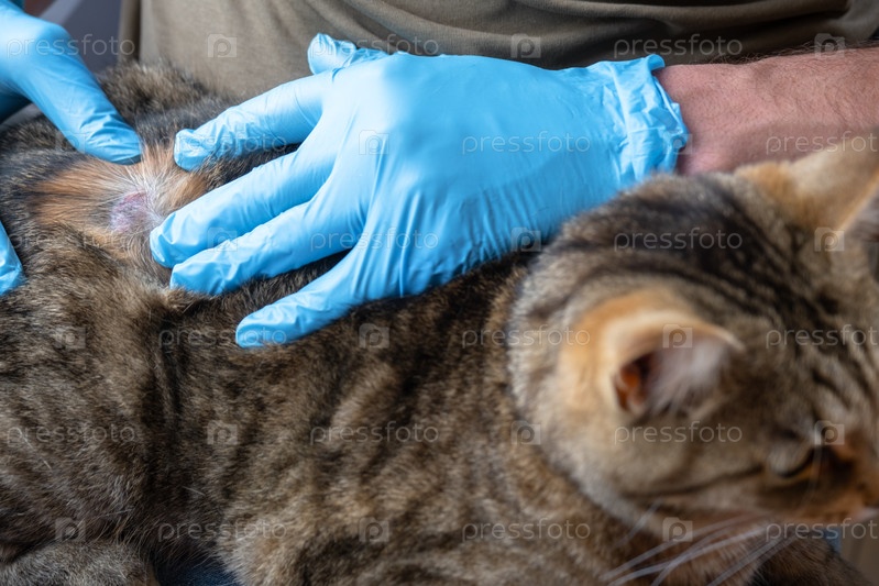 Кот Табби с каждым поражением осматривается в ветеринарной клинике, выявляется грибковая инфекция, возможно приобретенная на улице, лечение начинается у ветеринара