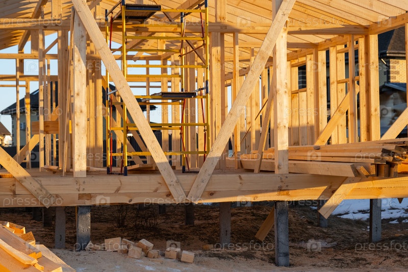 Фундаментный вид деревянного каркасного дома, деревянные балки, поддержка конструкции, плотничество, скелетная рама на свайях, установка и подкрепление, рабочее место, сборочная площадка
