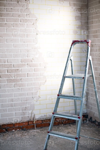 Комната под ремонтом со ступенчатой лестницей, отделкой стен, подготовкой штукатурки и краски, улучшением жилища, строительством помещений и проектом реконструкции интерьера