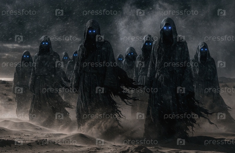 Мистические фигуры с капюшоном, выполняющие ритуал со свечами в сюрреалистическом пустынном пейзаже под сияющим инопланетным небом ночью