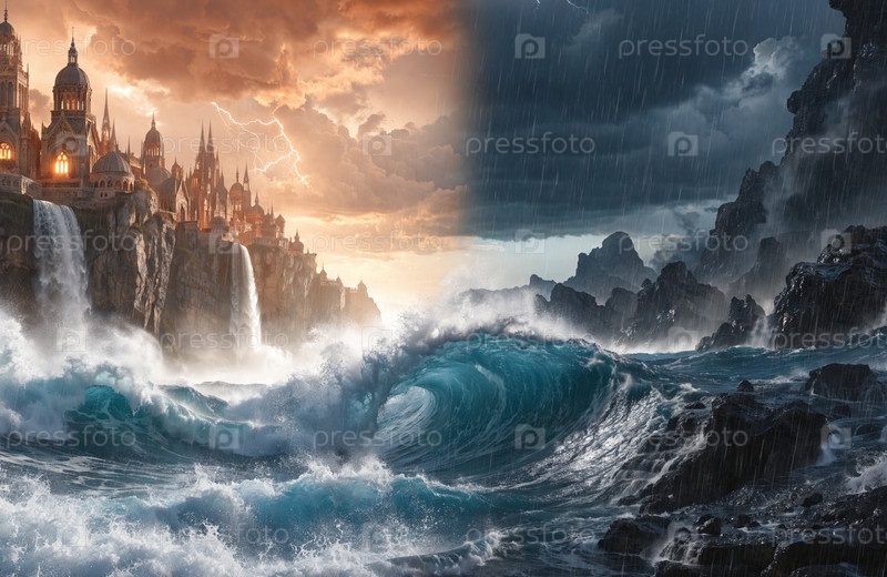 Эпический фэнтезийный пейзаж с молнией, огнем и космическим светом над мистической долиной, когда одинокий герой сталкивается со своей судьбой