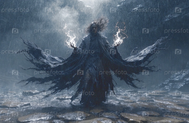 Фантастический маг, бросающий магию огня и льда в темном мистическом пейзаже с светящейся энергией и руинами