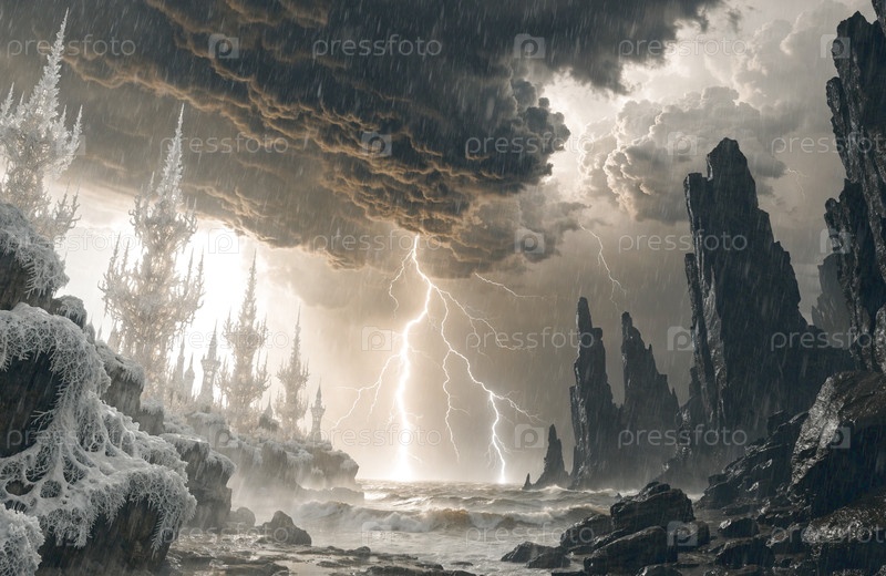 Эпический фэнтезийный пейзаж с молнией, огнем и космическим светом над мистической долиной, когда одинокий герой сталкивается со своей судьбой