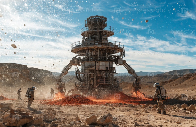 Футуристический научно-фантастический город на пустынной планете с передовыми башнями, машинами по уборке урожая и инопланетным пейзажем под несколькими лунами при закате солнца