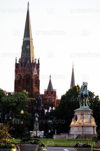 Генерал-майор Джордж Генри Томас конная статуя в Thomas Circle в Вашингтоне с исторической церковью