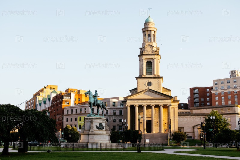 Генерал-майор Джордж Генри Томас конная статуя в Thomas Circle в Вашингтоне с исторической церковью