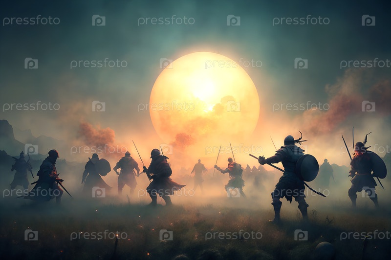 Эпические фэнтезийные боевые силуэты воинов, сражающихся с гигантским демоном под огромным полнолунием в туманной ночной битве