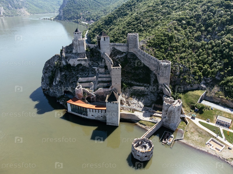 Вид с воздуха на крепость Голубац на реке Дунай, окруженную зелеными холмами и историческими каменными стенами