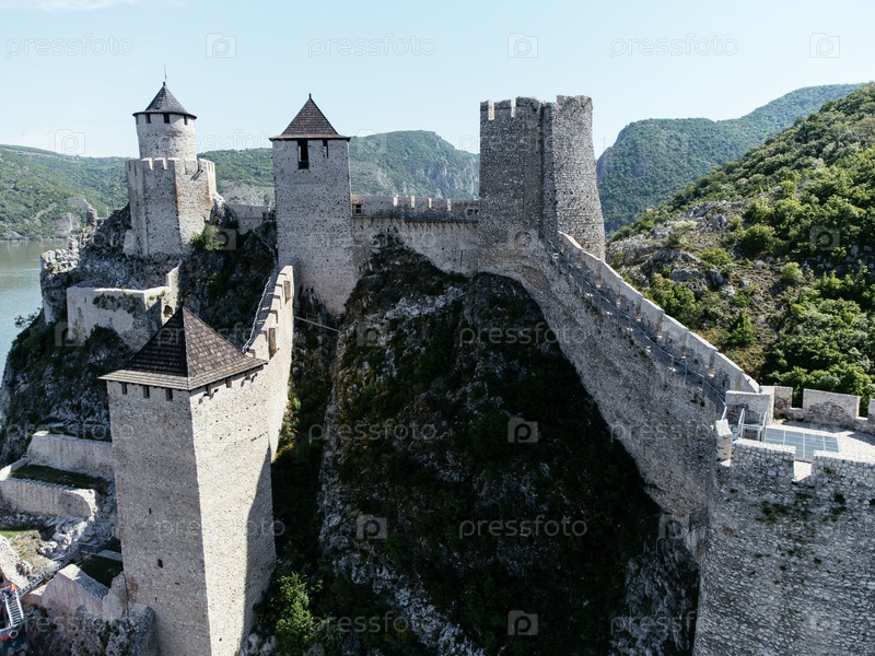Вид с воздуха на крепость Голубац на реке Дунай, окруженную зелеными холмами и историческими каменными стенами