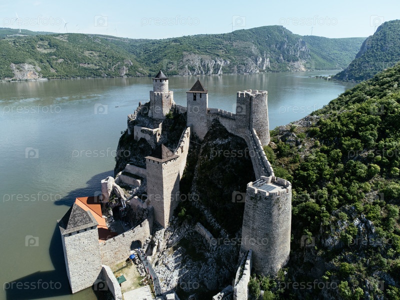 Вид с воздуха на крепость Голубац на реке Дунай, окруженную зелеными холмами и историческими каменными стенами