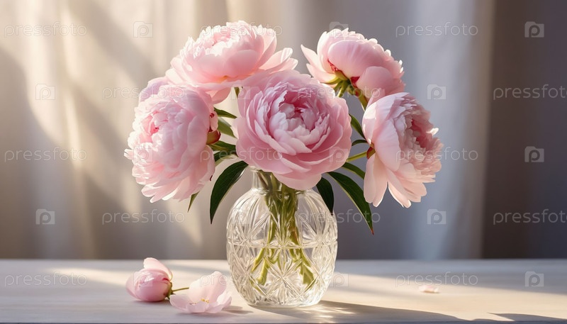 Деликатные розовые пионы расположены в прозрачной стеклянной кастрюле на кухонном стойке Яркое солнечное утро
