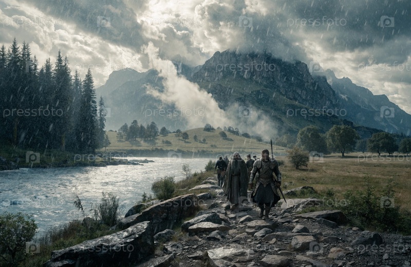 Группа фантастических приключенцев с видом на обширную горную долину и реку при восходе солнца, эпическое путешествие пейзажной сцены. g
