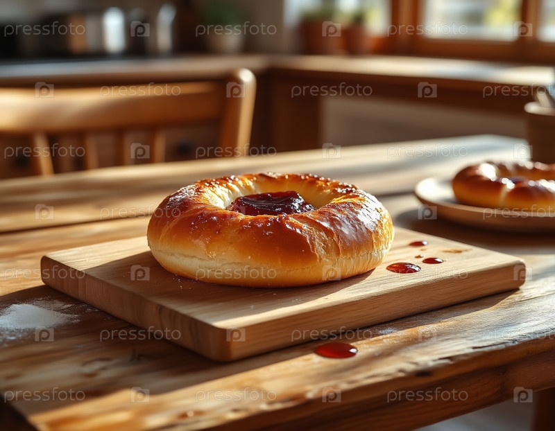 Золотая булочка для выпечки с красным варенем на деревянной поверхности солодкого утреннего наслаждения