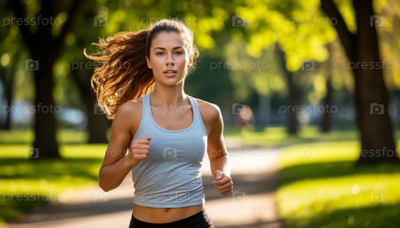 Молодая женщина атлетического строения бегает в парке во время лета на открытом воздухе Фитнес-бег