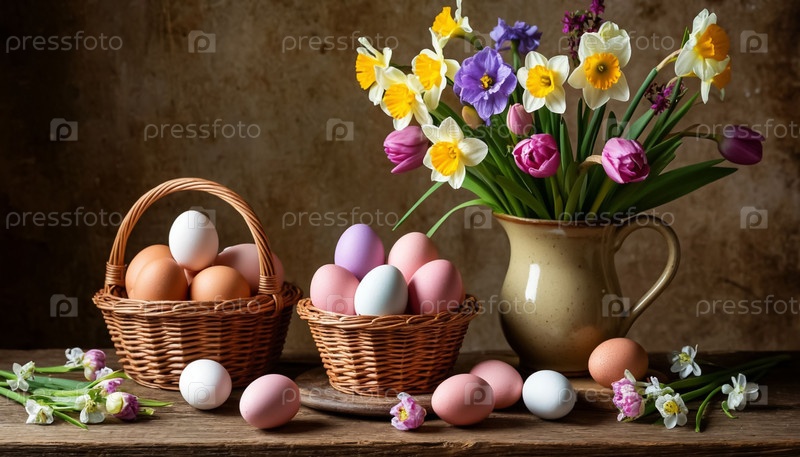 Рустический пасхальный натюрморт с окрашенными яйцами и цветами луга Пасторальная сцена