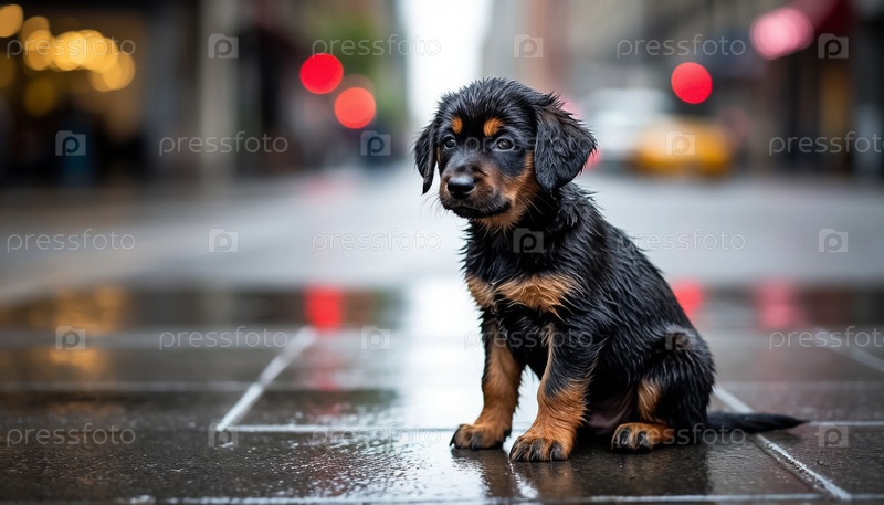 Маленькое щенко в дожде на асфальте Фон Благополучие животных и усыновление Печально
