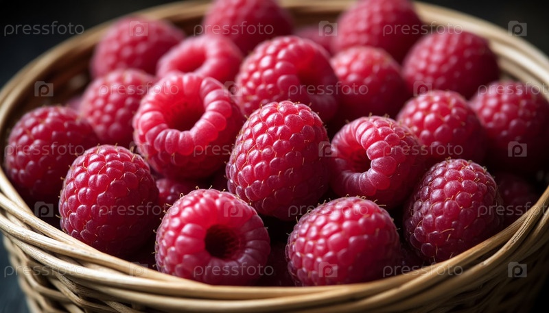 Свежие красные малины в мини-корзине, изолированной на деревенском фоне Здоровая закуска
