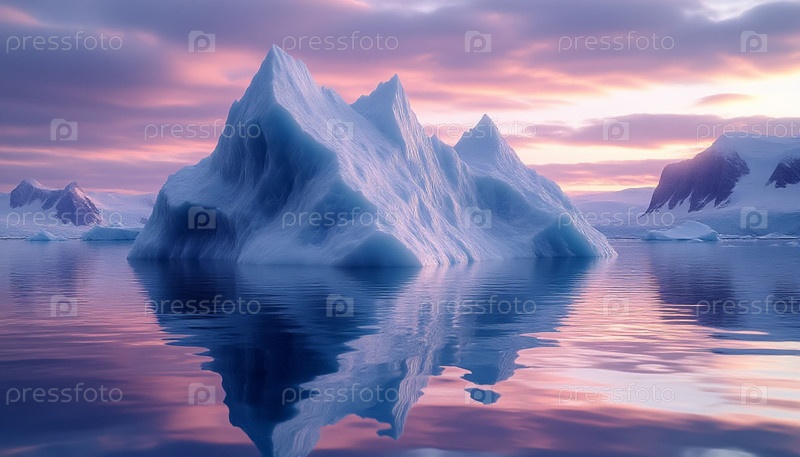 Айсберг в море на восходе солнца фиолетовый лиловый небо светящийся свет холодная арктическая природа