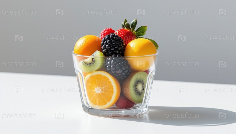 Разнообразные свежие фрукты и ягоды сложены в прозрачной стеклянной чашке Красочная здоровая закуска