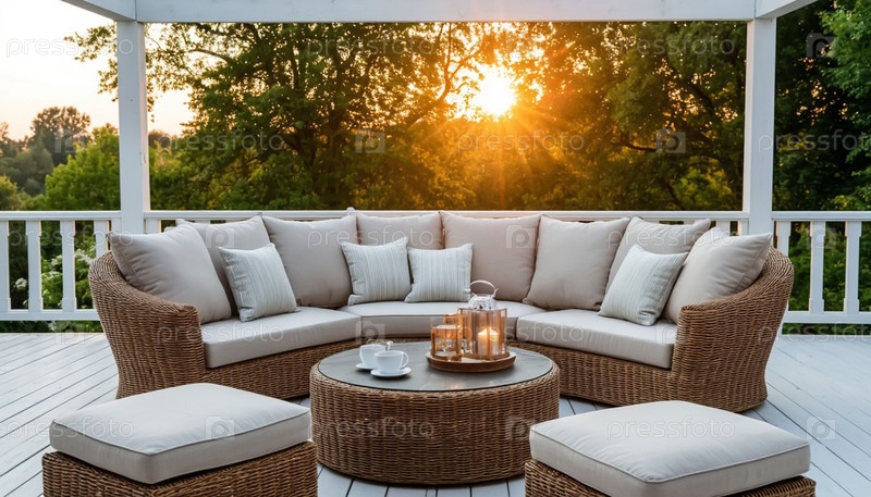 Диван Wicker на яркой террасе в рассвете, идеально подходит для летнего интерьерного дизайна и концепций садового декора Round