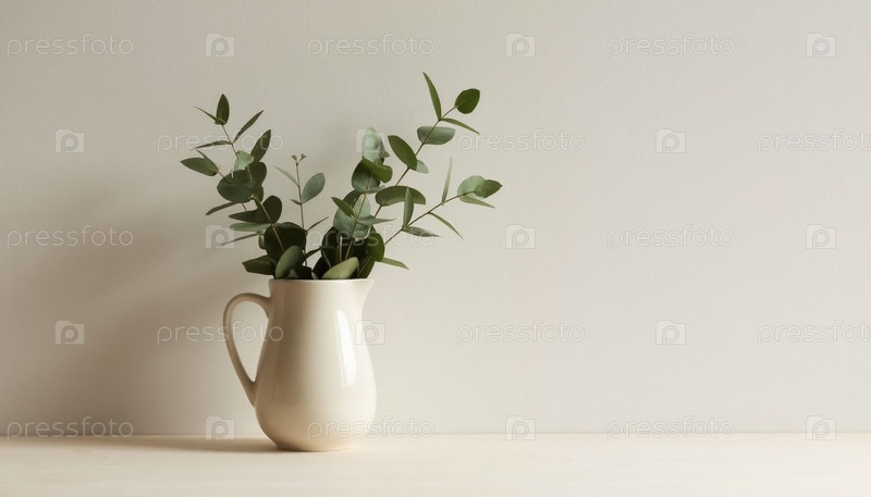 Растительные ветви в белом керамическом кувшине на минималистском светло-зеленом молочном фоне