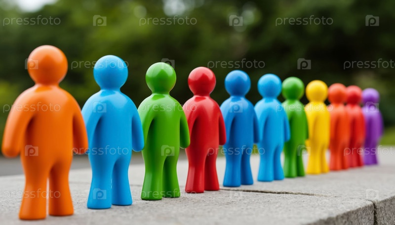 Ряд фигур игровых игрушек цвета радуги выстроились в ряд, представляя организацию персонала и концепцию создания команды