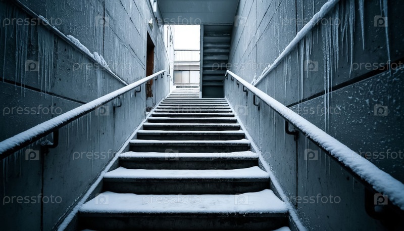 Холодная лестница холодной ступени Ледяные шаги и замороженные рельсы Зимняя городская сцена