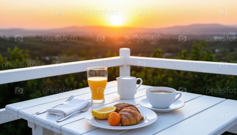 Завтрак подается на белой деревянной террасе, свежие утренние легкие обеды на открытом воздухе