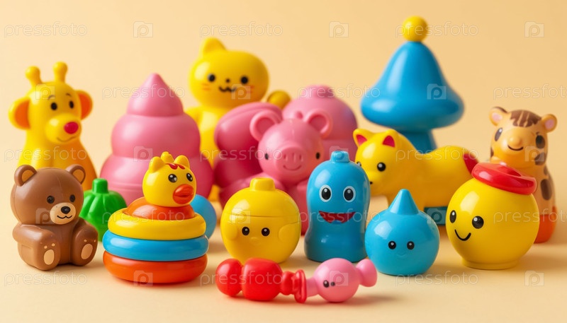 Коллекция детских игрушек из пластика и резины на пастельном бежевом фоне Детские игрушки