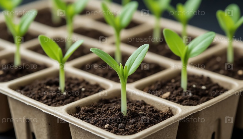 Весенние саженцы в биоразлагаемых торфяных горшках Макрофотография