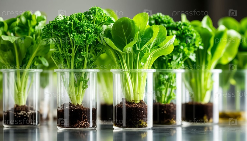 Генетически модифицированные зеленые растения выращиваются в стеклянных трубках Лабораторное сельское хозяйство