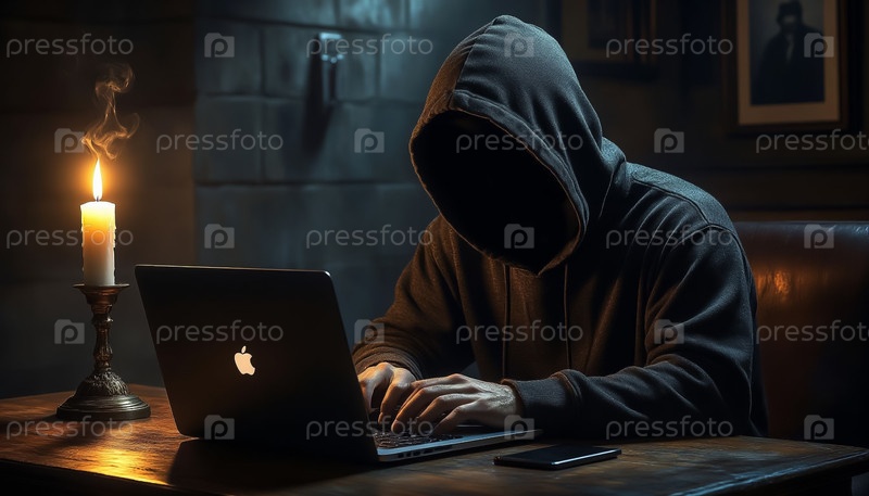 Анонимный хакер в толстовке с капюшоном использует ноутбук на темной сцене кибербезопасности