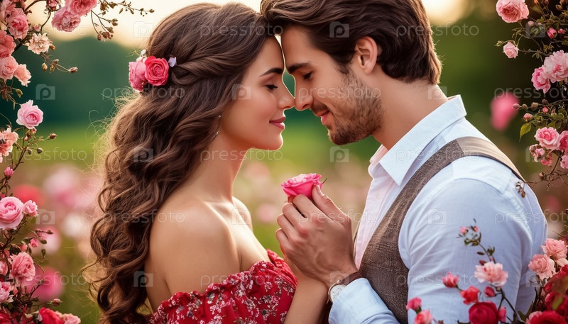 Романтический поцелуй пары среди многих цветов Иллюстрация празднования дня святого Валентина