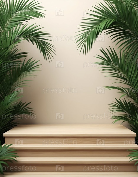 Бежевый деревянный презентационный подиум с пальмовыми ветвями по бокам Рустический декор