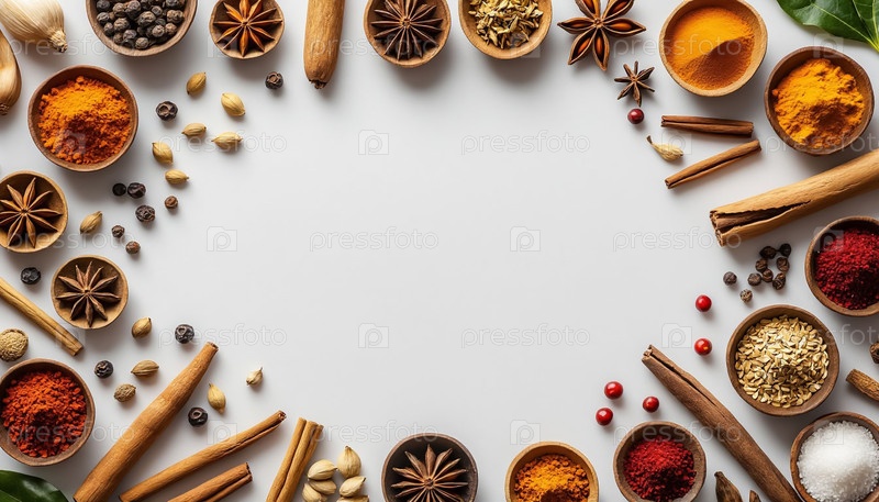 Различные экзотические специи и приправы Flat Lay на белом фоне