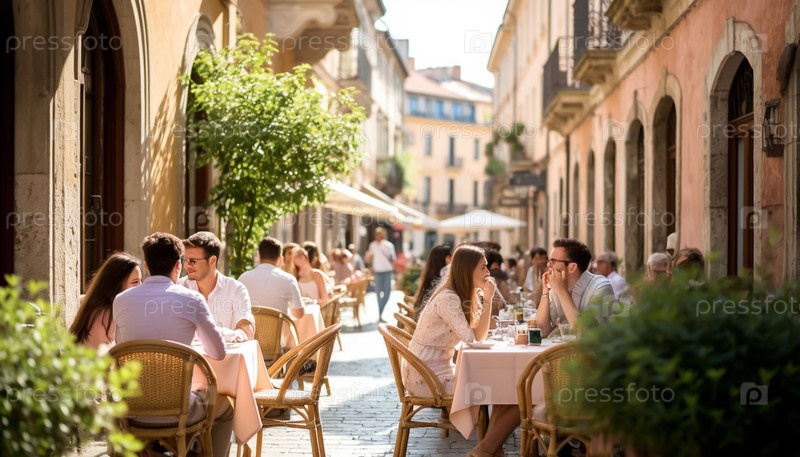 Летняя сцена в Старом Европейском городе: Туристы в легких пастельных нарядах в кафе
