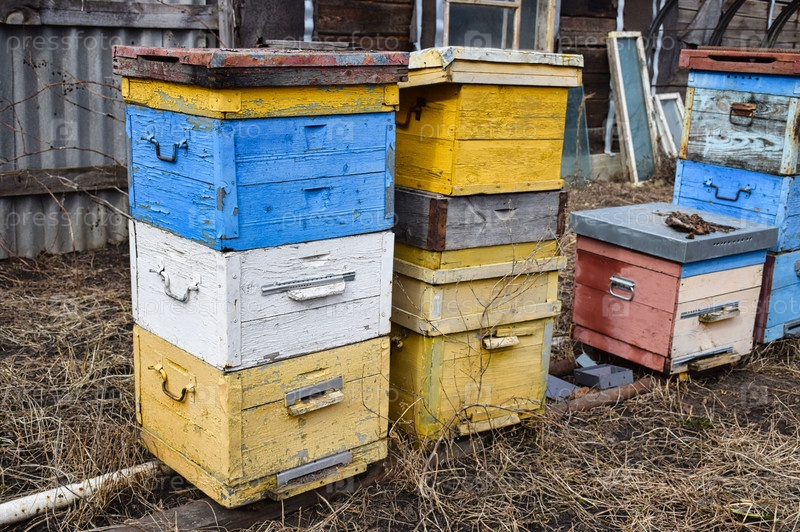 Пасека на открытом воздухе, сельский образ жизни. Передвижная пчелиная пасека. Домики для пчел