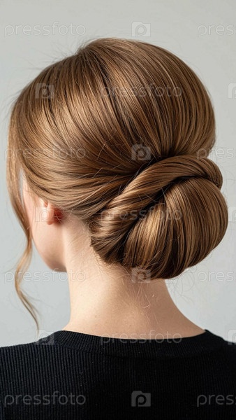 Женщина с утонченной прической-шиньон. Элегантная прическа «пучок» на светлом фоне. Сложная укладка волос в свадебную высокую прическу