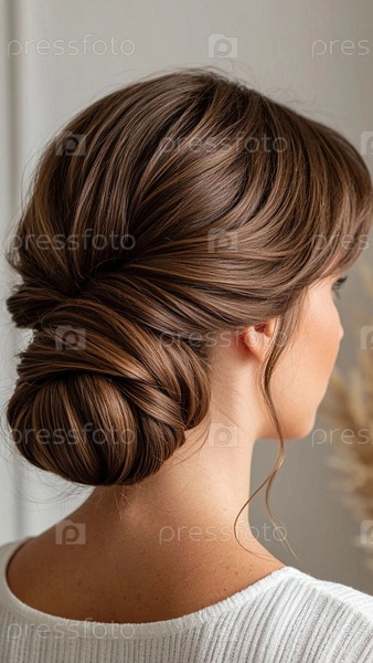 Женщина с утонченной прической-шиньон. Элегантная прическа «пучок» на светлом фоне. Сложная укладка волос в свадебную высокую прическу
