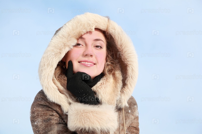 Женщина улыбается в зимнем пальто с меховой капюшоном