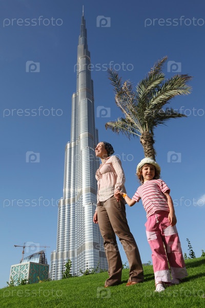 ДУБАЙ - 17 АПРЕЛЯ: Мать с ребенком перед Бурдж-Халифом (Burj)