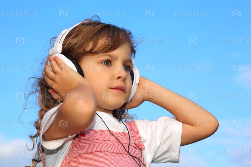 Милая маленькая девочка, напротив голубого неба, слушает музыку