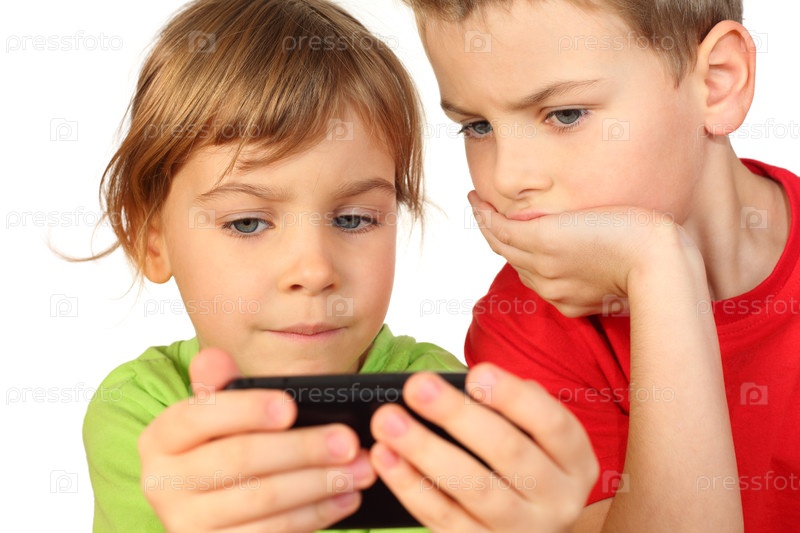 Два ребенка сосредоточены на экране смартфона вместе