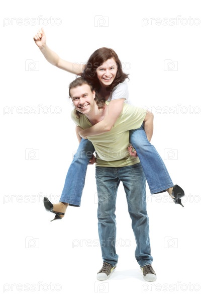 Молодая пара радостно смеется на белом фоне