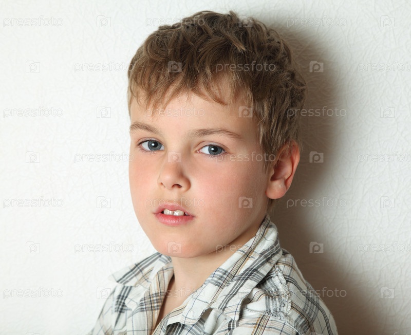 Портрет внимательного молодого блондинского мальчика в квадратной рубашке, около 8